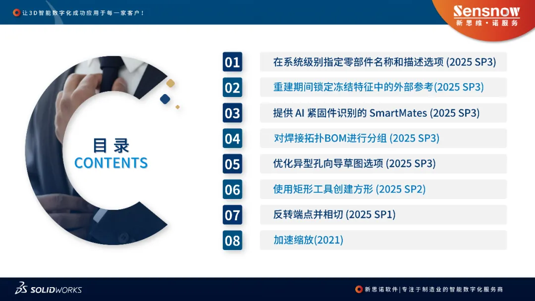 工程師速來!SOLIDWORKS超實(shí)用新功能直播詳解——8大升級(jí)功能一網(wǎng)打盡,高效操作不容錯(cuò)過!包括在系統(tǒng)級(jí)別指定零部件名稱和描述選項(xiàng)、重建期間鎖定凍結(jié)特征中的外部參考、AI賦能的智能緊固件識(shí)別SmartMates、焊接拓?fù)銪OM分組功能、異型孔向?qū)Р輬D優(yōu)化、矩形工具創(chuàng)建方形、反轉(zhuǎn)端點(diǎn)并相切操作以及加速縮放性能提升等!直播不僅涵蓋2025 SP3最新增強(qiáng)內(nèi)容,還兼顧2025 SP2和SP1的實(shí)用更新,甚至包含自2021版本以來的效率優(yōu)化功能實(shí)操,真正實(shí)現(xiàn)從設(shè)計(jì)到裝配的全流程效率突破。直播中JOE將結(jié)合實(shí)際應(yīng)用場景演示操作技巧,幫你徹底解決參考關(guān)系混亂、裝配卡頓、BOM表耗時(shí)等常見痛點(diǎn)。