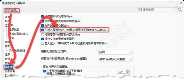 要打開自動識別功能,需勾選:選項 -> 系統(tǒng)選項 -> 裝配體 -> 在插入零部件時,使用 AI 緊固件識別創(chuàng)建 SmartMates。