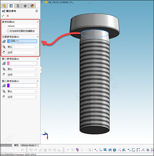 在 SOLIDWORKS 2025 SP 3 版本中增加了對緊固件的 AI 智能識別,對于沒有“配合參考”且不是“Toolbox”零件的緊固件可以在拖入的過程中 SOLIDWORKS 能夠識別看起來像螺絲、墊圈、螺母的零件,并自動向零部件添加配合。