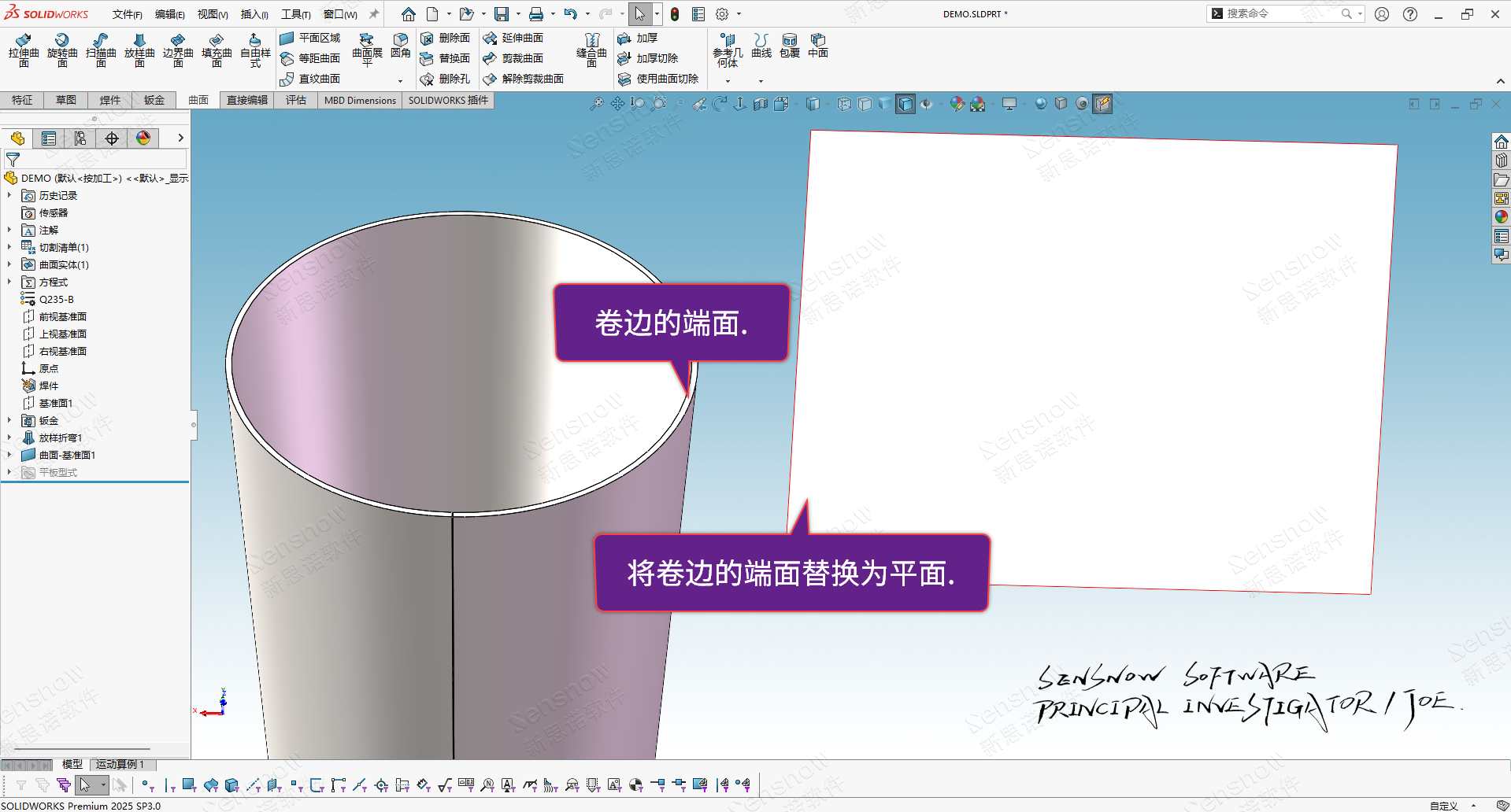 此時(shí),我們可以在 SOLIDWORKS 中創(chuàng)建兩處基準(zhǔn)平面分別繪制草圖,將卷邊的模型面使用轉(zhuǎn)換實(shí)體引用的方式投射到基準(zhǔn)面中,然后使用平面區(qū)域功能創(chuàng)建平面曲面,最后再使用替換面的方式將卷邊面替換為平面即可。處理過(guò)后的模型再次創(chuàng)建倒角特征就不會(huì)復(fù)發(fā)此問(wèn)題了,也不會(huì)影響到鈑金的展開(kāi)。