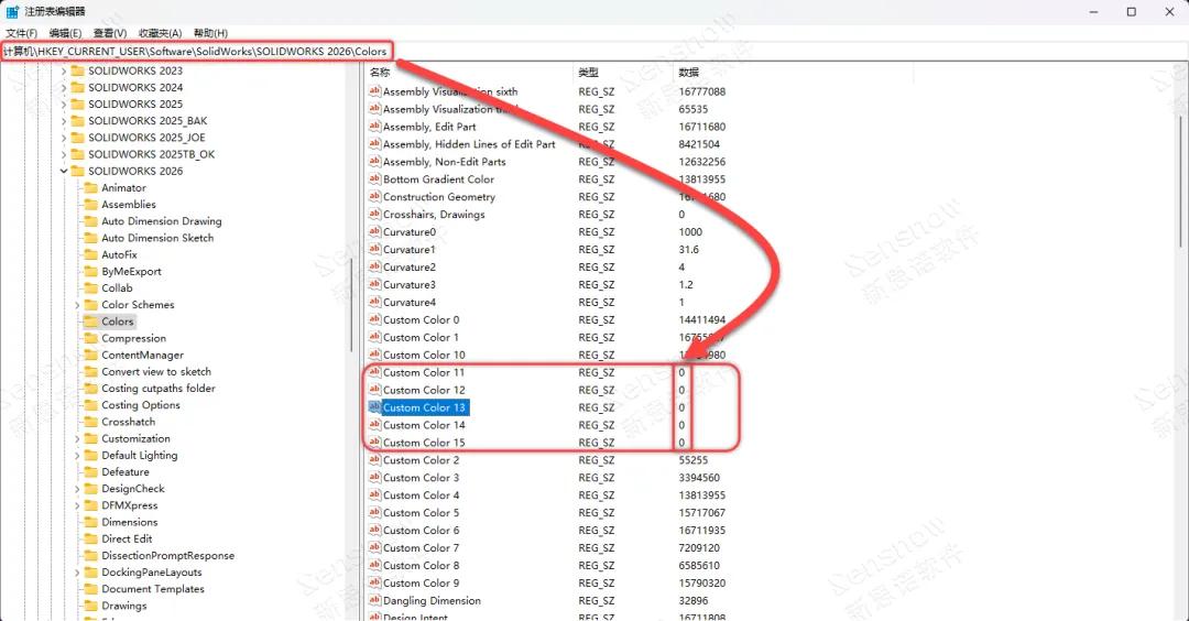 STEP3:打開注冊表,轉入:計算機\HKEY_CURRENT_USER\Software\SolidWorks\SOLIDWORKS XXXX\Colors,找到一個默認鍵值為“0”的顏色注冊表,此示例使用“Custom Color 15”層進行演示,代表設置后在 SOLIDWORKS 顏色窗口中最后一個色塊的注冊表鍵值,編輯此鍵值更改為“9988112”;