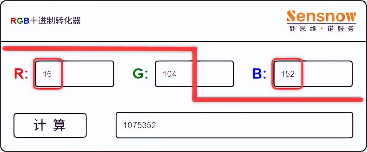 STEP2:這里以柔藍為例,RGB 分別是:16/104/152;登錄會員系統找到 RGB 轉換十進制程序,RGB 中分別輸入:152/104/16,需要交換 R/B 值!得出計算結果:9988112 進行記錄;